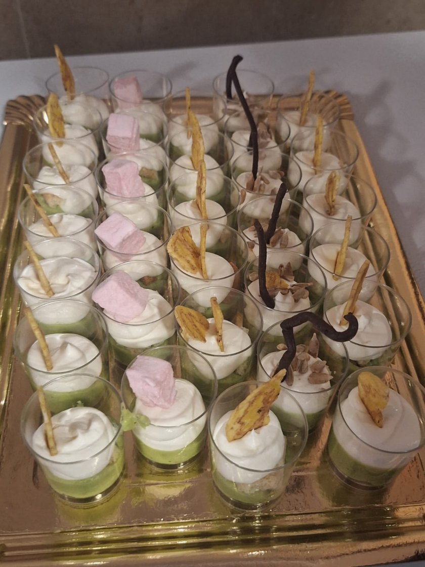 Estos vasitos llevan distintos ingredientes. Guacamole, pan tostado desmenuzado, queso Philadelphia, Tortolines, Chifles, plátano deshidratado...