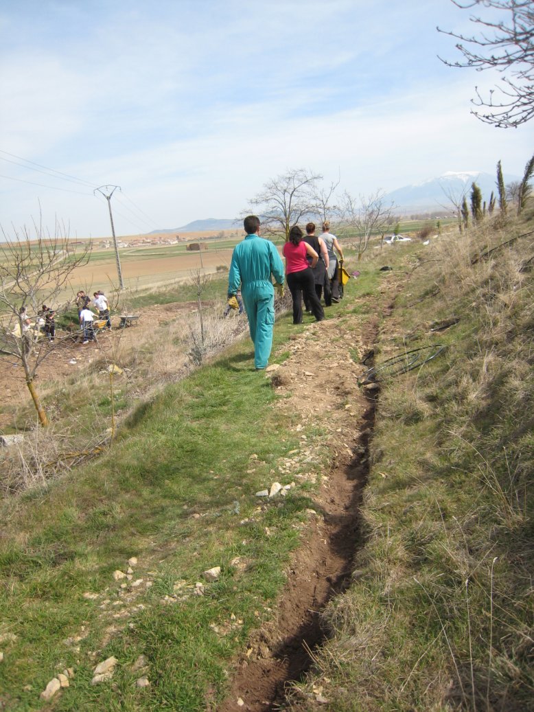 El programa empezó a las 9 y ½ de la mañana para repartir el trabajo. Unos se dedicarían a plantar árboles en la zona de la Tenería y la Balsa, otro grupo a limpiar el terreno del paseo de la Tenería, otro grupo, dada la proximidad de la Semana Santa, a limpiar la Iglesia, otro a poner a punto la zanja del riego por goteo de la zona de la Nevera, y otro, fundamental, a preparar la intendencia... Una mañana completa y un trabajo bien hecho, interrumpido sólo para degustar un bocadillo a base de pan con jamón y tortilla. El jamón había sido regalado por Raúl Martínez Pérez, y las tortillas por Juan Largo Domínguez, a quienes desde aquí agradecemos su colaboración.