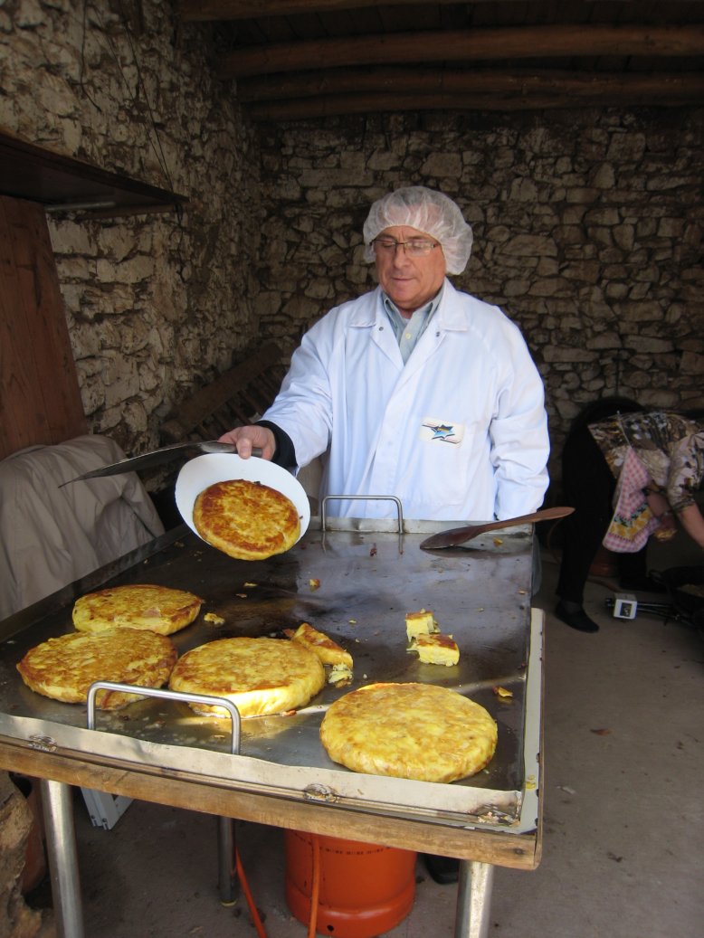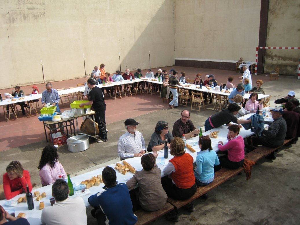 Una vez concluida la fase de campo llegó la hora de comer. Dado el buen tiempo y lo espléndido del día, se decidió comer en el frontón. Previamente, el equipo de intendencia, compuesto fundamentalmente por Antonio, Nicolás y Nati, había preparado unas alubias rojas con chorizo y de segundo unas costillas. Ambos platos estaban “para chuparse los dedos”. Para este evento, pudimos degustar, además de pan, agua, vino y gaseosa, una excelente sidra, obsequio de los nuevos vecinos Merche y Joserra, a quienes también desde aquí agradecemos el magnífico detalle. Para postre, los dulces sobrantes de la invitación que la Asociación de Amigos de Trébago hizo en Nochevieja.