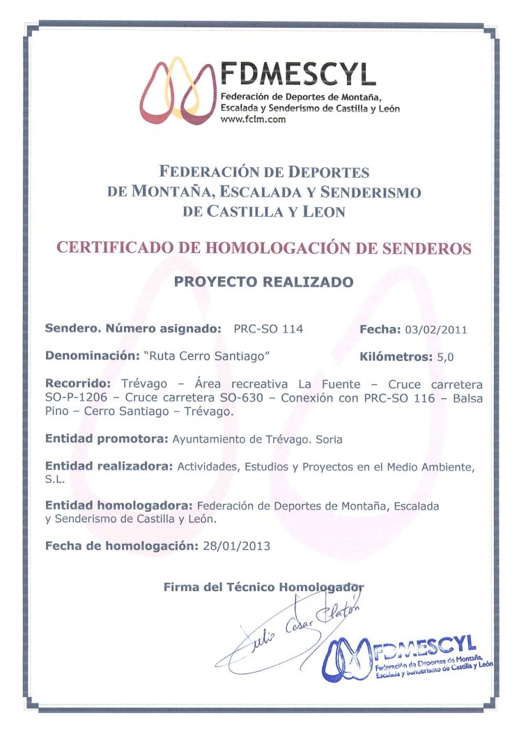 Trébago, 20/03/2013. Nos pasa Anselmo Jiménez, alcalde de Trévago, copia de los Certificados de Homologación de Senderos, expedidos por la Federación de Deportes de Montaña, Escalada y Senderismo de Castilla y León el pasado 28 de enero de 2013.
