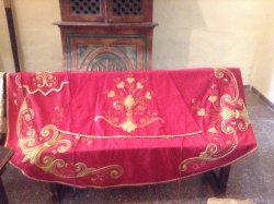 Con la disculpa de la restauración de la imagen, D. Alfonso ha puesto en la capilla de San Ramón diversos mantos, manteles y joyas de la Virgen para su exposición.