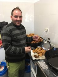 Por cierto, las rosquillas salieron extraordinarias. Dos docenas de huevos. Para batir la masa se usó una varilla ajustada a un taladro, porque a mano era bastante complicado hacerlo.