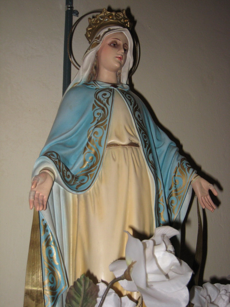 En el lado de la epístola veremos a Ntra. Sra. de la Medalla Milagrosa, pequeña figura de escayola regalada hace cincuenta años por Sor Otilia Martínez, hija de la caridad, nacida en nuestro pueblo. La primera aparición de la Medalla Milagrosa tuvo lugar el domingo 18 de julio de 1830 en París, en la capilla de la casa central de las hijas de la caridad, a una religiosa llamada Catalina Laboure. Celebramos su fiesta el 27 de noviembre.